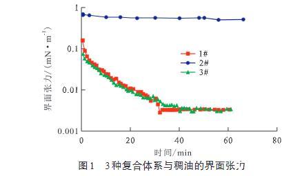 在比較3種復(fù)合體系驅(qū)油特征之前,應(yīng)確定其能否滿足超低界面張力和良好乳化性能的基本設(shè)計(jì)要求。因此,首先針對選用的復(fù)合體系,測試其與稠油的界面張力(圖1)。1#超低界面張力復(fù)合體系和3#雙效復(fù)合體系與稠油的界面張力均能達(dá)到超低水平,為3.0×10-3mN/m;而2#乳化復(fù)合體系與稠油的界面張力為5.1×10-1mN/m。3種復(fù)合體系與稠油的界面張力表現(xiàn)出顯著的不同,符合進(jìn)一步驅(qū)油對比的需要。此外,盡管超低界面張力有利于減小毛細(xì)管力和稠油在巖石壁面的黏附功,但是對于稠油復(fù)合驅(qū),乳化降黏機(jī)理極為關(guān)鍵,需進(jìn)一步對3種復(fù)合體系的乳化性能加以研究。