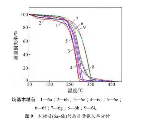 圖9所示為熱質(zhì)量損失結(jié)果。從圖9可見:烷基吡喃木糖苷6a~6i均只有1個(gè)質(zhì)量損失臺(tái)階,起始分解溫度分別為157.9,177.3,172.6,162.3,164.1,169.5,151.7,170.4和208.9℃左右,最大分解速率時(shí)的溫度依次為283.2,287.8,296.6,257.9,290.4,286.1,301.9,262.7和339.8℃。糖苷6a~6i熱分解完時(shí)的溫度分別為303.1,298.1,329.6,365.5,320.4,340.2,332.0,374.6和356.2℃??傎|(zhì)量損失率為94.9%,89.9%,91.0%,91.9%,95.3%,96.6%,89.6%,88.5%和91.5%。結(jié)果表明:合成的烷基吡喃木糖苷在150℃以下是穩(wěn)定的。