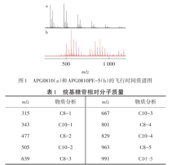 由圖1可以看出,m/z315表示單糖苷的C8烷基糖苷,m/z343表示單糖苷的C10烷基糖苷,m/z477與m/z315相差M(162),162表示一個(gè)葡萄糖脫掉一個(gè)水的相對分子質(zhì)量,APG0810的分子質(zhì)量組成分析如表1所示。
