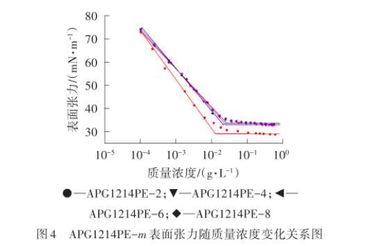 平衡表面張力揭示了表面活性劑降低溶劑(通常是水)表面張力的能力。表面活性劑的許多應(yīng)用都與平衡表面張力有關(guān),例如起泡作用、潤濕作用、鋪展作用等。圖2為APG0810PE-n和APG0810平衡表面張力隨著質(zhì)量濃度變化的關(guān)系圖,圖3、圖4為APG1214PE-m和APG1214平衡表面張力隨著質(zhì)量濃度變化的關(guān)系圖,相應(yīng)的物化性能參數(shù)列于表3。