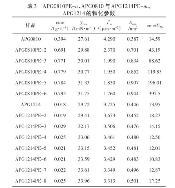 由表3可以看出,APG0810PE-n的cmc、γcmc、Amin均高于APG0810,且隨著PO添加量的增加而增大,PO基團(tuán)的引入增加了分子的空間位阻以及被吸附分子在氣/液界面所占的面積。因此,Гm會(huì)隨之降低,并且隨著PO基團(tuán)的增加降低得更明顯。同樣,對于APG1214PE-m也有相同的趨勢。