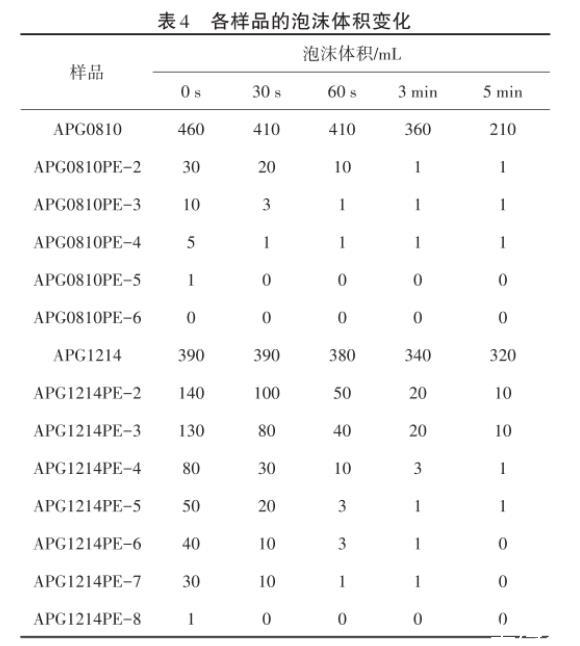 泡沫是氣體在液體中的分散體系,氣體成為氣泡被連續(xù)相的液體分隔開,氣體是分散相,液體是分散介質(zhì)。在大規(guī)模的洗滌和印染工業(yè)中,泡沫給操作帶來不便,因此新型的低泡表面活性劑越來越受關(guān)注。由表4可以看出,PO基團(tuán)引入APG中明顯地降低了泡沫的形成和穩(wěn)定性,而且在相同PO加合數(shù)下,APG0810變化更明顯,因此制備的系列樣品屬于低泡表面活性劑。