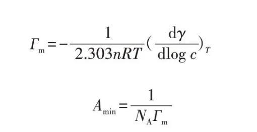 其中:T表示絕對溫度,通常取298 K;R表示氣體常數(shù),通常取8.314 J/(mol·K);NA表示阿伏加德羅常數(shù),通常取6.022×1023;n也表示常數(shù),對于離子表面活性劑n取2,對于非離子表面活性劑n取1;dγ/dlogc是指在恒溫情況下,表面張力γ隨表面活性劑濃度對數(shù)logc變化的變化率。