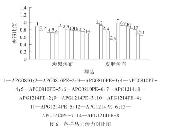 污垢通過不同的相互作用力在物品表面附著,而應(yīng)用表面活性劑去除的污垢一般是通過物理吸附(范德華力、偶極相互作用)或者靜電作用而附著于物品上。去污力是指將固體表面浸泡在一定的液體介質(zhì)中去除污垢的能力,使用洗滌劑減少污垢在固體表面的附著量,利用機(jī)械力使污垢與固體表面分離。由圖6可以看出,無論是皮脂污布還是炭黑污布,制備的APG0810PE-n和APG1214PE-m的去污比值都低于對應(yīng)的原料APG0810和APG1214,而且隨著PO加合數(shù)的增加而降低,可能是由于PO基團(tuán)的引入使得分子的疏水性提高。但整體來看,PO改性APG獲得的產(chǎn)品去污性能仍處于較好的水平。