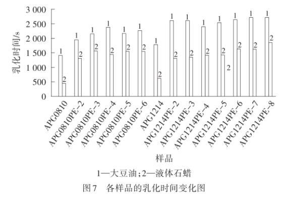 由圖7可以看出,采用乳液破乳時(shí)間表征表面活性劑的油水界面性質(zhì),APG1214和APG1214PE-m乳化大豆油以及液體石蠟的能力勝于APG0810以及APG0810PE-n,而且隨著PO加合數(shù)的增加而提高。這是由于PO基團(tuán)和烷基鏈增長提供了疏水性,增強(qiáng)了乳化劑分子的乳化能力,延長了破乳時(shí)間。此外,所有表面活性劑乳化大豆油的能力均明顯強(qiáng)于乳化液體石蠟,表明PO基團(tuán)可能具有類似極性作用,可以增強(qiáng)樣品與極性分子之間的協(xié)同作用,因此乳化性能更好。