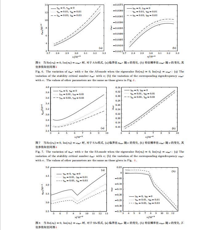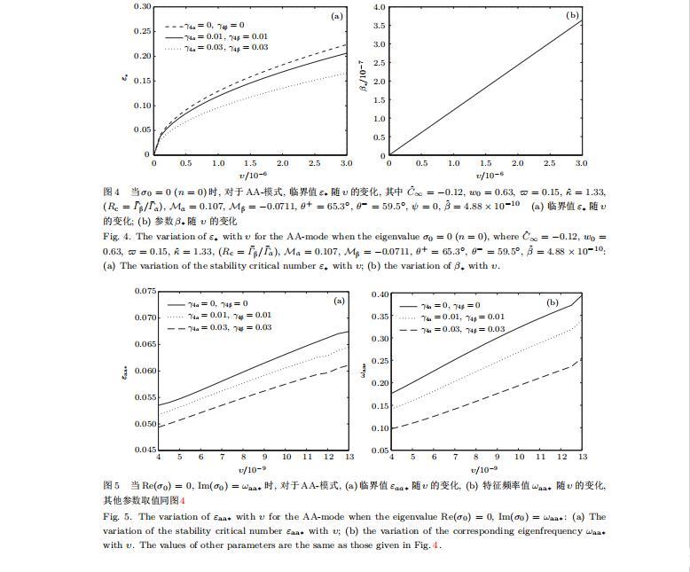由量子化條件可以看出特征值σ0是關于參數(shù)ε和γ4的隱函數(shù).任意給定參數(shù)ε和γ4,可以得到一個復數(shù)值σ0.為了更好地闡明生長條件對共晶生長系統(tǒng)的影響,引入無量綱參數(shù)[11,12]υ=?c,αV/κD,它反映拉速V的大小;?β=??c,α(G)D/mαCe,它反映溫度梯度(G)D的大小.通過化簡可以知道,υ=ε3ˉΓα,?β=υG/M.本文采用與Xu[23]研究枝晶的形態(tài)穩(wěn)定性相似的方法,對于四種震蕩模式得到各自對應的穩(wěn)定臨界值εaa?,εas?,εsa?和εss?.共晶生長系統(tǒng)穩(wěn)定的選擇判據(jù)為:
