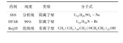選用3種表面活性劑開(kāi)展浮選精煤脫水過(guò)濾試驗(yàn)。3種表面活性劑分別為十二烷基硫酸鈉(SDS)、十二烷基三甲基溴化銨(DTAB)、月桂醇聚氧乙烯醚(Brij35)。3種藥劑的疏水端均為十二烷基,親水端分別為硫酸根、銨根以及聚氧乙烯醚,3種藥劑的物理化學(xué)性質(zhì)見(jiàn)表3。