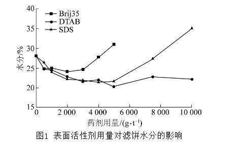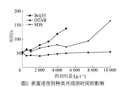 過濾過程中,成餅速率與脫水速率成正比,成餅速率越快,過濾時間越短。從圖2可以看出,Brij35和SDS兩種藥劑的成餅時間均隨藥劑量的增加而增加,Brij35的增加最為迅速,在用量為4 000 g/t時從不添加藥劑時的55 s上升至137 s,SDS在達(dá)到最佳藥劑量之前成餅時間變化并不明顯,但在超過最佳藥劑量后,成餅時間迅速上升。DTAB能略微減少成餅時間,在最佳用量時成餅時間從不添加藥劑時的55 s減少到50 s。