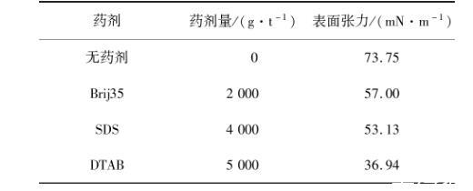 在浮選精煤過(guò)濾階段,濾餅中存在較強(qiáng)的毛細(xì)作用,水分難以排出。降低液相的表面張力可從根本上降低毛細(xì)力,使大量的毛細(xì)水從煤粒的間隙中排出。試驗(yàn)對(duì)不加藥及3種藥劑最佳用量時(shí)濾液的表面張力進(jìn)行測(cè)定,結(jié)果見(jiàn)表6。從表6可以看出,在不加藥時(shí)濾液的表面張力最高,為73.75 mN/m,比水的表面張力72.75 mN/m略高,其原因可能是浮選精煤表面殘留的浮選藥劑進(jìn)入了濾液。在添加了表面活性劑后,3個(gè)濾液樣品的表面張力均有不同程度的下降。其中,添加Brij35的濾液表面張力較高,為57.00 mN/m,添加了SDS的濾液表面張力略低于Brij35,為53.13 mN/m,而添加了DTAB的濾液表面張力最低,僅為36.94 mN/m。表面張力的降低可顯著促進(jìn)煤顆粒間毛細(xì)水的脫除。