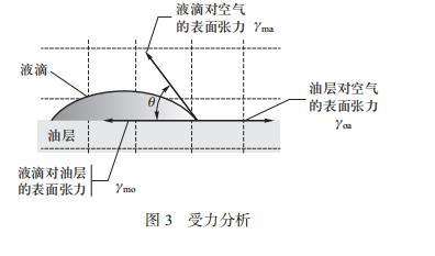 液滴爆炸現(xiàn)象的第二階段邊緣處的液滴產(chǎn)生液滴噴發(fā)現(xiàn)象,在該過(guò)程中液滴中部較厚的部分不斷向邊緣輸送液體,因此會(huì)穩(wěn)定持續(xù)一段時(shí)間。為解釋這一階段,先從表面張力入手,因?yàn)榻佑|角的不同,水對(duì)油的表面張力大于乙醇對(duì)油的表面張力,則混合液體對(duì)油層的界面張力介于水和乙醇之間?;旌弦旱沃幸掖嫉谋壤酱?,混合液體對(duì)油層的界面張力越小,受到向內(nèi)的張力減小,這樣整體向外的張力增大,這是產(chǎn)生向外推動(dòng)的驅(qū)動(dòng)力的重要原因。可見(jiàn)界面張力直接決定了液滴在界面上的擴(kuò)散和運(yùn)動(dòng)。