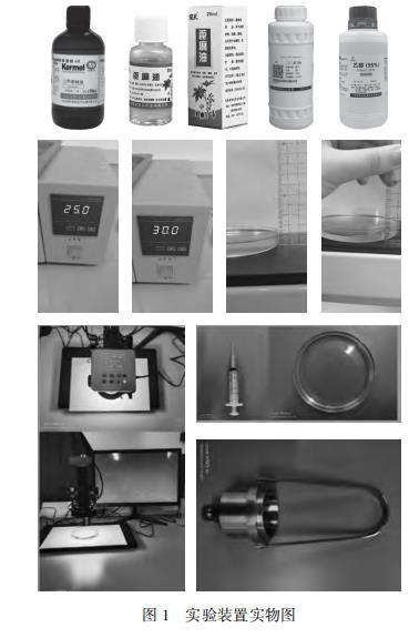 為了還原物理現(xiàn)象,初步探究液滴爆炸的原因,本文首先進(jìn)行了預(yù)實(shí)驗(yàn)。實(shí)驗(yàn)中所用到的物品包括:醫(yī)用75%酒精和蒸餾水混合形成水混合物液滴,家用菜籽油用作油池,普通藍(lán)墨水染色。在室溫環(huán)境下進(jìn)行實(shí)驗(yàn),預(yù)實(shí)驗(yàn)中發(fā)現(xiàn)普通藍(lán)墨水染色現(xiàn)象不明顯,改進(jìn)為采用甲基藍(lán)染色劑進(jìn)行染色。正式實(shí)驗(yàn)時(shí)準(zhǔn)備了不同種類的水混合物(乙醇、二乙二醇丁醚),不同種類的疏水性物質(zhì)(硅油、花生油、蓖麻油),不同厚度的疏水性物質(zhì)(5 mm、10 mm),設(shè)置合適的濃度梯度,采用恒溫水浴鍋來(lái)測(cè)定溫度。在顯微鏡下觀察液滴的運(yùn)動(dòng)過(guò)程,精準(zhǔn)測(cè)定液滴大小,利用注射器定量控制滴入液滴的體積,再利用黏度計(jì)測(cè)量黏性系數(shù),并對(duì)實(shí)驗(yàn)誤差進(jìn)行了修正。