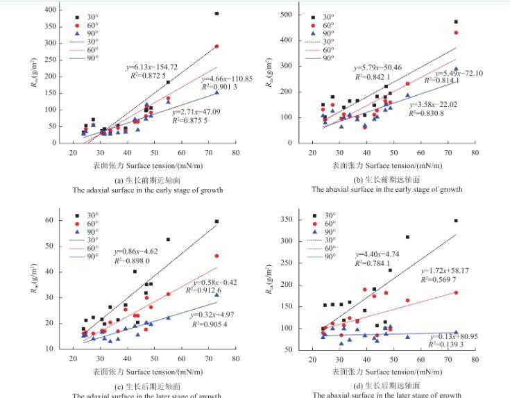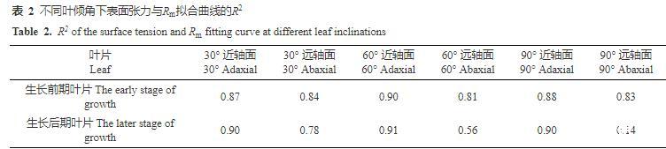 由表2結(jié)果可知,蘋果葉片生長前期近、遠(yuǎn)軸面和生長后期近軸面,不同葉傾角下表面張力與Rm值擬合曲線的R2均高于0.80。而蘋果葉片生長后期遠(yuǎn)軸面除30°時(shí)R2高于0.7外,其他葉傾角下均低于0.6,且隨著葉傾角增大,R2不斷減小,這表明蘋果葉片生長后期遠(yuǎn)軸面的表面張力與Rm值之間的線性關(guān)系較差。