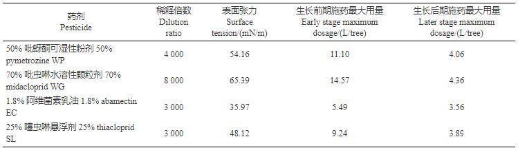 表3為4種常用農(nóng)藥制劑在推薦使用倍數(shù)下對蘋果樹的最大施藥量。從表中可以看出,在蘋果樹生長前期施藥的最大用量遠(yuǎn)高于在生長后期施藥??紤]到目前果園中使用的大容量噴霧器械多為手持柱塞泵式機(jī)動(dòng)噴霧機(jī),霧滴粒徑均一性較差,加之人為因素可能導(dǎo)致的藥液無法均勻覆蓋全樹,再結(jié)合張鵬九等在關(guān)于不同藥械防治蘋果園桃小食心蟲影響的研究中每株樹推薦使用藥液量為3.5 L,得出在果樹前期推薦藥液的表面張力應(yīng)在35 mN/m以下,后期應(yīng)在60 mN/m以上,便于實(shí)際操作。