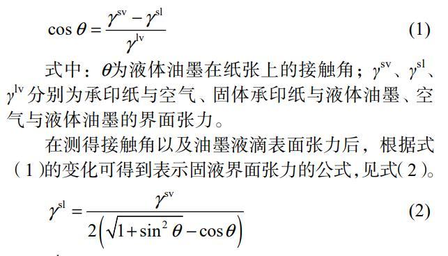 式中:θ為液體油墨在紙張上的接觸角;γsv、γsl、γlv分別為承印紙與空氣、固體承印紙與液體油墨、空氣與液體油墨的界面張力。在測(cè)得接觸角以及油墨液滴表面張力后,根據(jù)式(1)的變化可得到表示固液界面張力的公式,見式(2)。