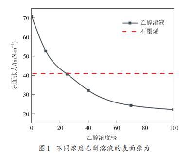 水和乙醇的表面張力分別為70.95 mN·m-1和22.17 mN·m-1,我們采用一定體積比的乙醇和水調(diào)配出與微晶石墨表面能接近的乙醇水溶液,并以此為溶劑球磨微晶石墨,研究溶劑的表面張力對球磨后微晶石墨粒徑的影響。從圖1可知,25%乙醇溶液的表面能為40.69 mN·m-1,與石墨烯的表面能(40.80 mN·m-1)相近,從圖2可知,其對應(yīng)的微晶石墨中位粒徑最小。當(dāng)溶劑的表面能與微晶石墨表面能相近時(shí),微晶石墨能更好地分散在溶劑中,從而提高球磨效率。所以在本工作中,選擇25%的乙醇水溶液作為球磨溶劑。