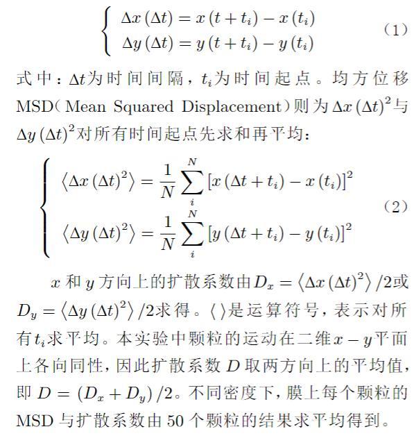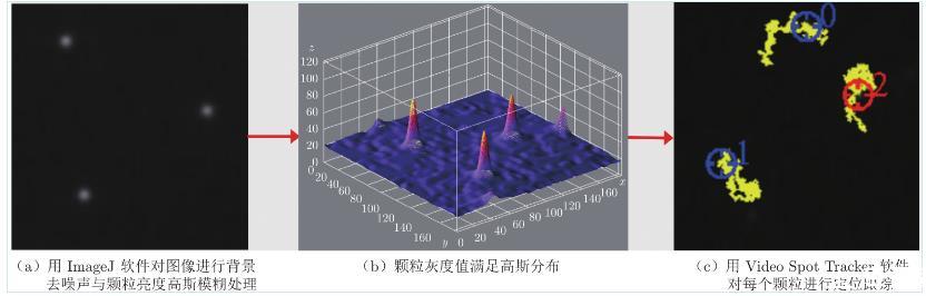 實(shí)驗(yàn)采用Olympus顯微鏡(配備60倍物鏡)觀察顆粒在膜上的布朗運(yùn)動,同時(shí)利用電子增益高速攝像機(jī)(Andor 897 EMCCD)進(jìn)行拍攝。每個(gè)視頻拍攝時(shí)間為200 s,幀頻為0.05 s,曝光時(shí)間5 ms,圖像尺寸為300像素×300像素,分辨率為0.26μm/m。采集原始圖像中的顆?;叶戎挡环蠘?biāo)準(zhǔn)高斯分布,因此使用圖像處理軟件ImageJ對圖像進(jìn)行背景去噪聲(Background Subtraction)和高斯模糊(Gauss-ian Blur)處理(圖3(a)),使顆?;叶戎颠_(dá)到標(biāo)準(zhǔn)高斯分布(圖3(b))。之后用Video Spot Tracker軟件定位每個(gè)顆粒的灰度峰值(圖3(c)),即顆粒質(zhì)心,定位誤差僅為0.5像素,進(jìn)而對顆粒二維運(yùn)動軌跡(平面)進(jìn)行實(shí)時(shí)跟蹤。軟件自動將顆粒在每一時(shí)刻的像素位置坐標(biāo)存入計(jì)算機(jī)中,使用MATLAB計(jì)算顆粒在不同時(shí)間間隔Δt內(nèi)沿和方向的位移,計(jì)算公式如下: