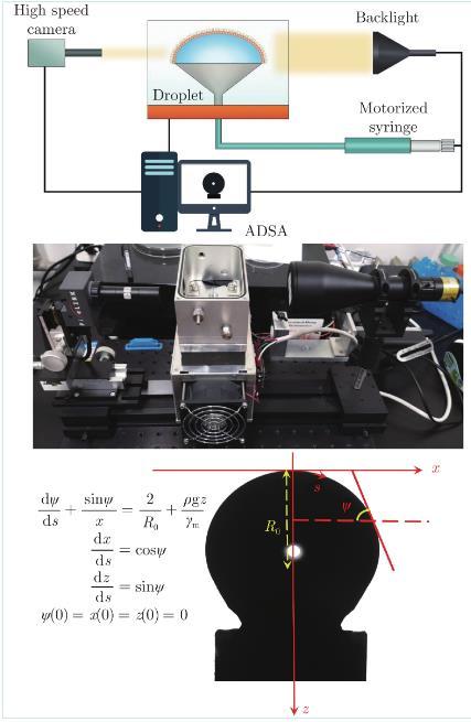 采用課題組自主研發(fā)的約束液滴表面測量儀(Constrained Drop Surfactometry,CDS)測量膜在不同密度下的表面張力,如圖1所示,圖中x與z分別代表水平與豎直方向,s代表液滴表面切向方向,ψ為液滴表面與水平方向內(nèi)夾角,R0為液滴半徑,ρ為液滴密度,g為重力加速度。CDS上的圓形基座用于盛放純水液滴(約10μL),以微量進(jìn)樣針將稀釋的固爾蘇–氯仿溶液滴定到液滴表面,形成形狀類似于肺泡的水?氣界面固爾蘇肺表面活性劑膜?;醒氲男】淄ㄟ^導(dǎo)管與注射器相連,注/抽水速度由Labview編程的推進(jìn)器控制,以此調(diào)節(jié)液滴表面積的變化速率。實(shí)驗(yàn)測量的是膜在壓縮過程中表面張力與膜密度變化的關(guān)系,液滴表面積以0.05的準(zhǔn)靜態(tài)速率縮小。液滴的輪廓由照相機(jī)拍攝。膜表面張力和表面積以ADSA(Axisymmetric Drop Shape Analysis)方法分析得出。膜表面壓強(qiáng),其中,純水表面張力。
