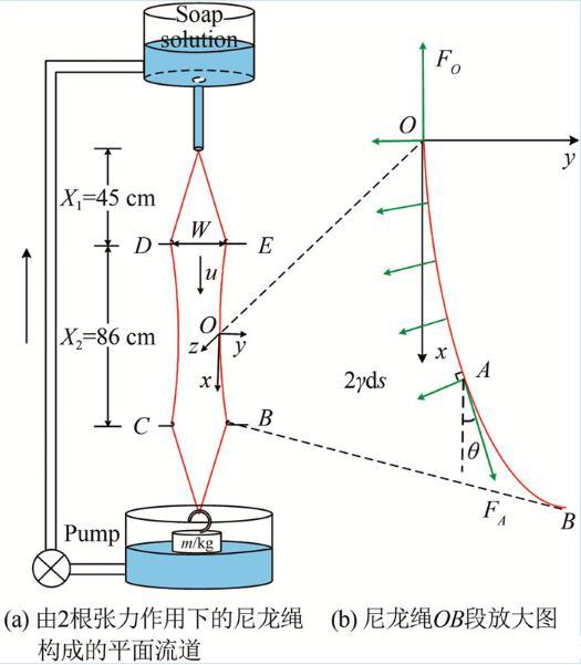 如圖1(a)所示,配制的皂液盛于上水箱中,經(jīng)一個(gè)狹長(zhǎng)的出水管流出,進(jìn)入一個(gè)由兩根直徑為0.32 mm的尼龍繩構(gòu)成的豎直平面流道(實(shí)驗(yàn)中,尼龍繩一直處于下方砝碼施加的張力作用下)。緊接出水管口的流道為漸擴(kuò)的擴(kuò)張段,其下為流道寬度不變的實(shí)驗(yàn)段和流道逐漸收窄的收縮段(在本文實(shí)驗(yàn)中,擴(kuò)張段長(zhǎng)度X1=45 cm;實(shí)驗(yàn)段長(zhǎng)度X2=86 cm,實(shí)驗(yàn)段入口寬度W=5 cm)。在擴(kuò)張段,皂液在重力驅(qū)動(dòng)下加速,當(dāng)重力和空氣阻力平衡時(shí)充分發(fā)展,最終在實(shí)驗(yàn)段達(dá)到勻速運(yùn)動(dòng),之后經(jīng)收縮段流入下水箱,再被泵回至上水箱,形成往復(fù)循環(huán)。