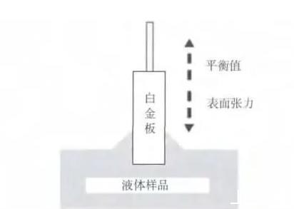 本試驗(yàn)表面張力值采用吊板法測(cè)量,如圖1所示:白金板因被測(cè)溶液的表面張力而將其向下拉,當(dāng)總表面張力與液體的重量平衡時(shí),通過測(cè)量白金板浸入待測(cè)溶液的深度,便可知溶液的表面張力值,其原理見式(1)。