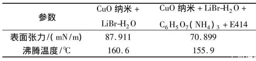 為了便于觀察3種表面活性劑對(duì)納米LiBr——H2O表面張力和沸騰溫度的影響,實(shí)驗(yàn)測(cè)量了不含此3種表面活性劑的納米LiBr——H2O的表面張力和沸騰溫度,見(jiàn)表1。