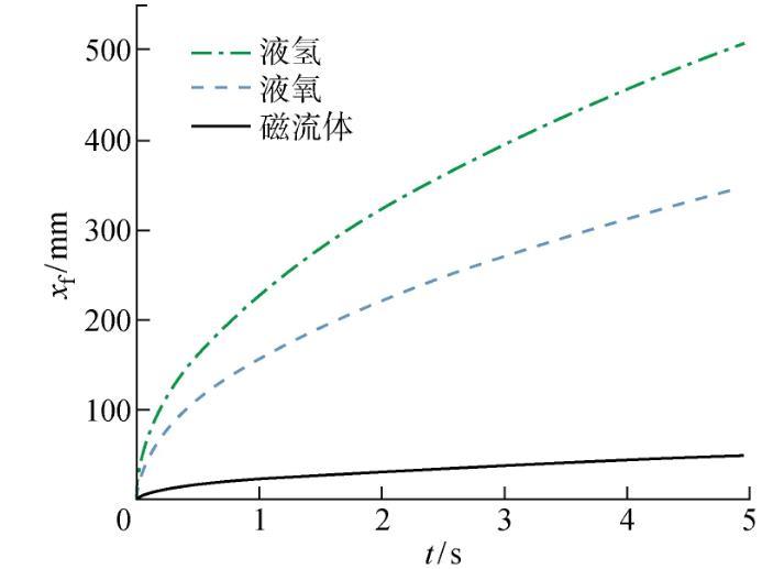 圖2為在τ=0.1,R=6×10-3m,α=15°的內角條件下,液氫、液氧以及磁流體的毛細爬升距離隨時間的變化曲線。由圖可見,液氫與液氧的流動速度均顯著高于前文實驗中的磁流體,且液氫的運動速度高于液氧。其原因在于盡管低溫推進劑的表面張力較小,但由于其黏滯系數(shù)同樣較小,因子σ/μ反而增大;且上述兩種流體對不銹鋼有很好的潤濕效果,最終導致爬升能力的提高。此外,對于上述兩種低溫推進劑,液氫的表面張力以及黏度均小于液氧,但由于黏度對流動的作用更顯著,所以液氫的運動速度始終高于液氧。