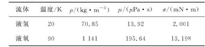 相較于常規(guī)推進劑,以液氫/液氧為代表的低溫推進劑具有高比沖、無毒、無污染等諸多優(yōu)勢,是目前以及未來很長一段時間內空間工程的首選推進劑。然而,低溫推進劑沸點低、汽化潛熱低等特殊物性,為其長期空間貯存和在軌管理技術帶來巨大挑戰(zhàn)。因此,對于低溫推進劑,采用表面張力式流體液體管理裝置是解決其空間應用難題的關鍵突破點?;谇拔牡拿毩鲃幽P停瑢σ簹?、液氧兩種流體的內角流動情況進行計算分析。液氫和液氧的物理性質參數(shù)如表1所示。為了與空間貯箱中的應用一致,采用低溫流體在不銹鋼表面上的接觸角(近似為0°)。