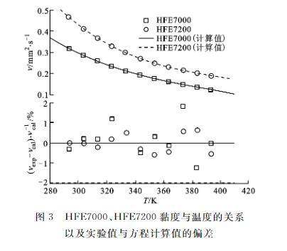 圖3 HFE7000、HFE7200黏度與溫度的關(guān)系以及實驗值與方程計算值的偏差