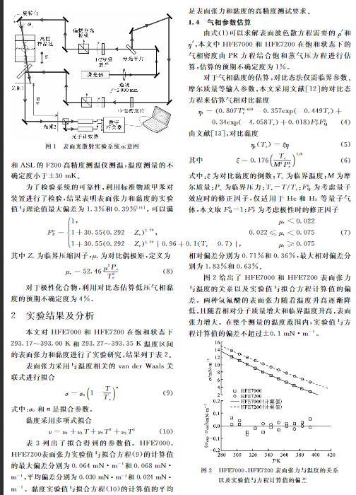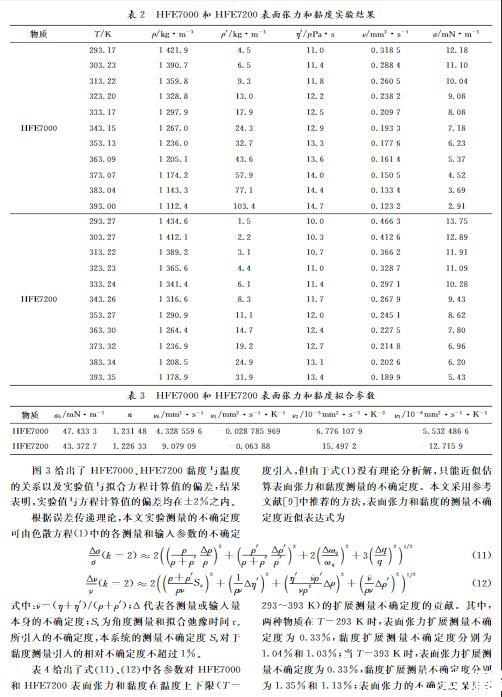 本文對HFE7000和HFE7200在飽和狀態(tài)下293.17~393.00 K和293.27~393.35 K溫度區(qū)間的表面張力和黏度進行了實驗研究,結(jié)果列于表2。