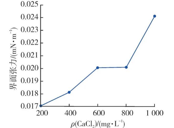 新疆M區(qū)油藏地層水礦化度較高,且在聚/表二元驅(qū)的實(shí)際應(yīng)用過程中,地層水的礦化度也是變化的,因此,還需進(jìn)一步考察礦化度對(duì)復(fù)配體系界面活性的影響,在HPAM質(zhì)量分?jǐn)?shù)為0.10%、OP-10質(zhì)量分?jǐn)?shù)為0.50%且兩者復(fù)配比例為1∶6的復(fù)配體系溶液加入NaCl和CaCl2,考察Na+和Ca2+各自對(duì)復(fù)配體系界面活性的變化。Na+對(duì)復(fù)配體系油水界面張力的影響見圖4,Ca2+對(duì)復(fù)配體系油水界面張力的影響見圖5。