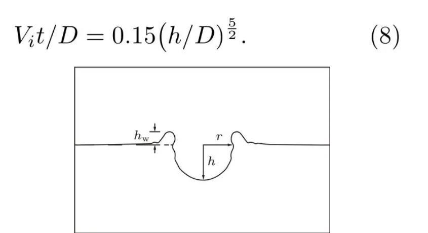 3)液滴撞擊深水液池后,空腔深度先以較快速度增長(zhǎng),在到達(dá)最大空腔深度后快速回彈,至接近原自由液面后速度逐漸放緩。在忽略毛細(xì)波作用、空腔深度為h=D至h=hmax范圍內(nèi)的前提下,空腔深度隨時(shí)間的成長(zhǎng)關(guān)系可由(Vit)/D=0.15(h/D)5/2來(lái)描述,但最終空腔底部的形成是由毛細(xì)波運(yùn)動(dòng)決定的;空腔寬度的增長(zhǎng)主要由毛細(xì)波運(yùn)動(dòng)及其干擾驅(qū)動(dòng),最后在慣性力作用下線性增長(zhǎng)。