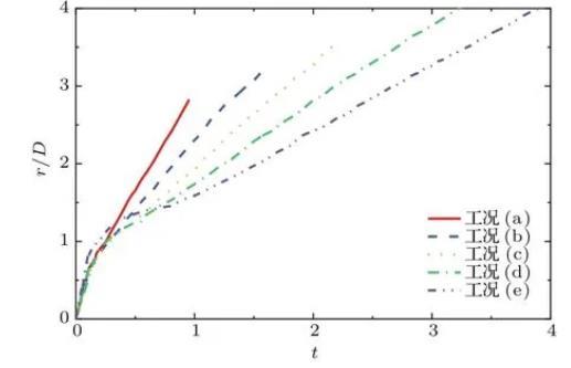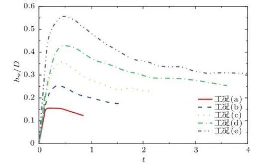 圖7及圖8分別為不同工況下波浪隆起高度hw和空腔寬度r隨時(shí)間的變化過(guò)程。由圖7易得,水滴撞擊水池后波浪高度的變化過(guò)程也經(jīng)歷了從快速增長(zhǎng)到逐漸回落,最終在慣性力的作用下自主運(yùn)動(dòng),趨于穩(wěn)定的過(guò)程。隨著弗勞德數(shù)的增大,更大的垂向速度在創(chuàng)造更深空腔的同時(shí)激發(fā)了更高的最大波浪隆起高度。從圖8可以看出,空腔寬度的增長(zhǎng)與波浪的運(yùn)動(dòng)息息相關(guān),在撞擊產(chǎn)生的動(dòng)能與波浪自身重力勢(shì)能基本耗散后,空腔運(yùn)動(dòng)主要由毛細(xì)波及其干擾驅(qū)動(dòng),最后在慣性下線性增長(zhǎng)。毛細(xì)波現(xiàn)象在圖8工況(e)的t=0.8時(shí)非常顯著,其周期在圖6的t=1.5—2.5中也有體現(xiàn)。