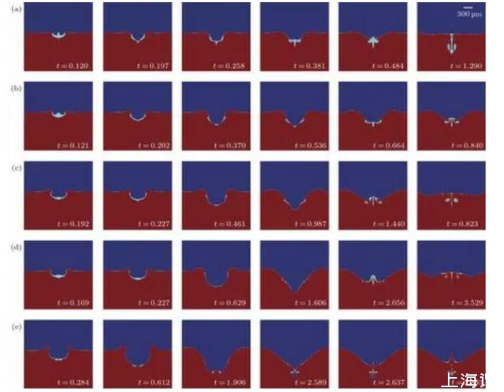 上述水滴撞擊水池的過(guò)程可以歸納為三個(gè)基本階段,第一階段為空腔的形成與膨脹;第二階段為毛細(xì)波傳播導(dǎo)致的空腔收縮;第三階段為空腔的回復(fù)。液滴撞擊深水液池時(shí)的運(yùn)動(dòng)分為完全聚結(jié)與部分聚結(jié)現(xiàn)象,在水滴與深水液池完全聚結(jié)時(shí),水滴入水時(shí)由于水滴底部發(fā)生凹陷變形產(chǎn)生的氣泡夾帶隨著撞擊速度的增加而減小,而在部分聚結(jié)發(fā)生時(shí)氣泡的夾帶與截留行為則更為復(fù)雜。