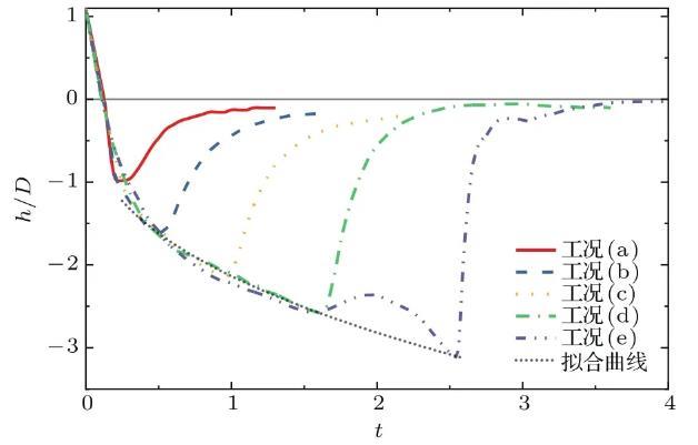 圖6為不同工況下空腔深度h隨時(shí)間的變化過(guò)程。由圖6可以看出,液滴撞擊深水液池后,由于動(dòng)能、空腔側(cè)壁隆起部分重力勢(shì)能以及表面張力能的驅(qū)動(dòng),空腔深度先以較快速度增長(zhǎng),其后增勢(shì)逐漸放緩,在到達(dá)最大空腔深度后快速回彈,至接近原自由液面后回彈速度逐漸放緩,近乎趨于直線。弗勞德數(shù)的增加對(duì)空腔深度變化影響顯著,在工況(a)中,弗勞德數(shù)僅為117.2,空腔能量耗散時(shí)程較短,回復(fù)較為迅速,隨著弗勞德數(shù)的增大,撞擊動(dòng)能增大,回復(fù)時(shí)程也逐漸增加。值得注意的是,在工況(e)中,由于空腔形狀由U形轉(zhuǎn)變?yōu)榻铺菪?,空腔在t=1.5—2.6時(shí)先緩慢上升,隨后毛細(xì)波向空腔底部傳遞,促使其底部變?yōu)閳A柱形,且深度繼續(xù)增加,最后空腔底部側(cè)壁坍塌形成射流,因此在t=2.6后空腔回復(fù)速度較其他工況更為迅速。將數(shù)值結(jié)果運(yùn)用最小二乘法擬合,得到的擬合曲線表達(dá)式如(8)式所示,該式能夠在忽略毛細(xì)波運(yùn)動(dòng)的前提下,在空腔深度為h=D至達(dá)到最大深度的范圍內(nèi)較好地描述了空腔深度隨時(shí)間的成長(zhǎng)關(guān)系,Liow等與Ray等對(duì)液滴撞擊運(yùn)動(dòng)中時(shí)間與空腔深度的關(guān)系進(jìn)行了建模,得出與本文相似的結(jié)論: