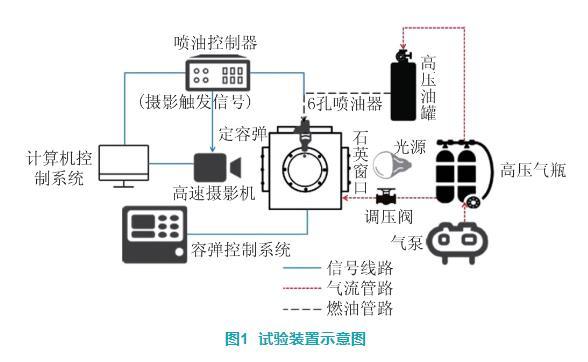 圖1為試驗裝置示意圖,主要由計算機控制系統(tǒng)、噴油系統(tǒng)控制器、高壓燃料供給系統(tǒng)、定容彈系統(tǒng)、高速攝像裝置等組成。