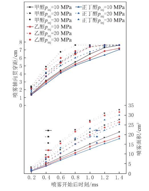 圖2為3種醇類燃料在背壓0.1 MPa、環(huán)境溫度20℃時,不同噴射壓力下噴霧開始后時刻0.2至1.4 ms內(nèi)的噴霧軸向貫穿距和噴霧面積的變化,其中pinj定義為噴射壓力。
