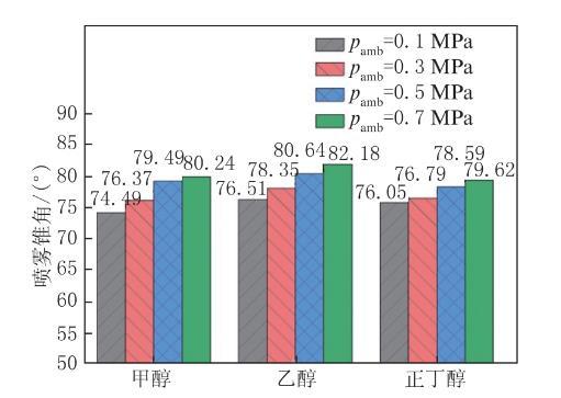 圖3環(huán)境壓力對醇類燃料噴霧錐角的影響