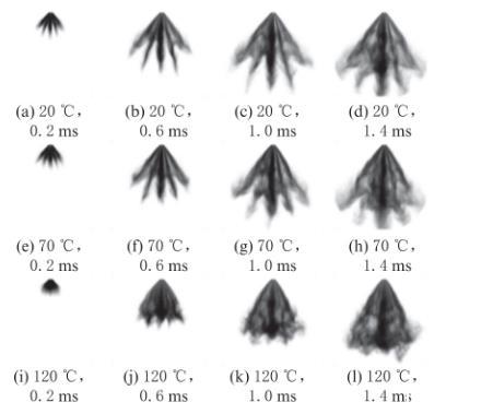 圖4不同環(huán)境溫度和噴霧開始后時刻下甲醇的噴霧形態(tài)