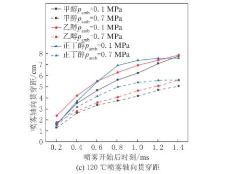 環(huán)境溫度升高至70℃、120℃時,正如圖8(b)和圖8(c)呈現(xiàn)出的,正丁醇的噴霧軸向貫穿距高于甲醇和乙醇,這與常溫常壓的環(huán)境條件下完全相反。盡管正丁醇的潛熱較低,但環(huán)境溫度和壓力的升高使甲醇和乙醇的過熱度高于正丁醇,進而引發(fā)更高的顯熱,提升了甲醇和乙醇的蒸發(fā)率,導致醇束發(fā)展緩慢。