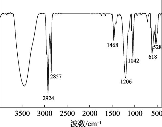 圖1為TAC的FTIR譜圖。從圖1可以看出,2924 cm–1處為主鏈甲基的C—H鍵的伸縮振動吸收峰;2857 cm–1處為主鏈亞甲基C—H鍵的伸縮振動吸收峰;1468 cm–1處為甲基和亞甲基C—H鍵的面內(nèi)搖擺振動吸收峰;1206 cm–1為磺酸基團中C—S鍵的不對稱伸縮振動吸收峰;1042 cm–1處為胺基C—N鍵的面內(nèi)彎曲振動吸收峰,表明TAC結(jié)構(gòu)中存在季銨基。618和528 cm–1處為—SO 3-的中強吸收峰,表明TAC結(jié)構(gòu)中存在磺酸基。上述結(jié)果表明,TAC符合預(yù)先設(shè)計的結(jié)構(gòu)。