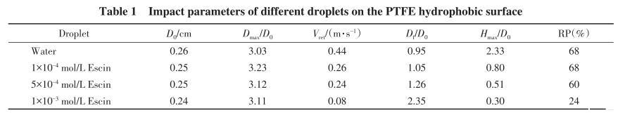 從圖5(B)和(C)及表1可以看出,不同液滴在疏水表面上發(fā)生撞擊后均發(fā)生相似程度的鋪展,之后發(fā)生回縮.水滴回縮速率(0.44 m/s)較大,且回縮百分比達到68%.向水中加入少量七葉皂素,濃度為1×10-4mol/L時,回縮速率(0.26 m/s)明顯降低,但回縮百分比沒有明顯改善.隨著七葉皂素濃度增大,液滴回縮明顯減弱.濃度為1×10-3mol/L時,回縮速率低至0.08 m/s,且僅液滴的24%發(fā)生回縮,可以認為達到了很好的抑制回彈的效果.而考察彈跳情況時發(fā)現,水滴因完全彈起離開表面,所以Hmax/D0最高達到2.33.與之相比,七葉皂素加入后,明顯抑制了液滴的彈起,且隨著濃度增大,抑制作用明顯增加.