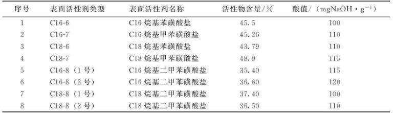 石油磺酸鹽具有降低油水界面張力、來(lái)源廣和價(jià)格低等優(yōu)勢(shì),因而在三次采油中占有極其重要的地位。但同時(shí)由于它的未磺化油含量較高,造成低滲透油層的注入困難。烷基苯磺酸鹽是一種碳鏈長(zhǎng)度固定、結(jié)構(gòu)相對(duì)單一的表面活性劑,其未磺化油含量相對(duì)較低,遠(yuǎn)遠(yuǎn)小于石油磺酸鹽。筆者通過(guò)配制弱堿三元復(fù)合體系評(píng)價(jià)其界面活性,試驗(yàn)研究了烷基苯磺酸鹽結(jié)構(gòu)與界面活性的關(guān)系,旨在為弱堿三元復(fù)合驅(qū)優(yōu)選表面活性劑提供重要依據(jù)。