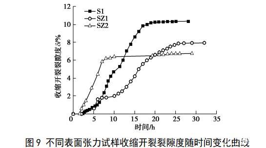 圖9不同表面張力試樣收縮開裂裂隙度隨時(shí)間變化曲線