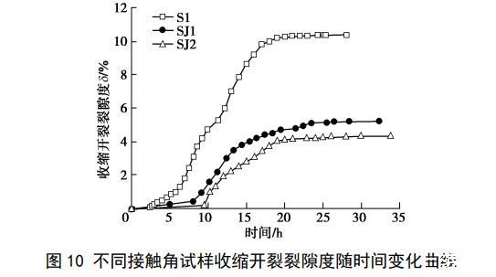 圖10為不同接觸角試樣收縮開裂裂隙度隨時(shí)間的變化關(guān)系曲線,接觸角變化后,土體收縮開裂的3個(gè)階段并不會(huì)發(fā)生改變,但土顆粒的接觸角越大,試樣經(jīng)歷第一階段,即收縮開裂醞釀階段的時(shí)間越長(zhǎng),相同的脫濕時(shí)間,接觸角越大的土樣所對(duì)應(yīng)的收縮開裂裂隙度越小。試驗(yàn)結(jié)束后,SJ1樣和SJ2樣的最終收縮開裂裂隙度分別為5.2%和4.3%,是所有試樣中收縮開裂裂隙度最小的兩個(gè),其中接觸角最大的SJ2樣的試樣最終收縮開裂裂隙度又比SJ1樣小。由此可見,增大土顆粒與孔隙水間的接觸角可以很好的抑制土體的收縮開裂。