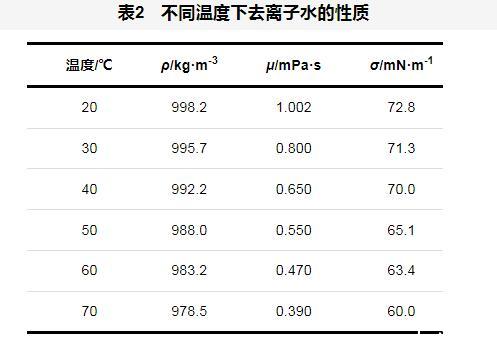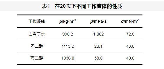 能夠在壁面上完全鋪展的液膜不僅僅與壁面的結(jié)構(gòu)和潤濕性有關(guān),還與液體本身的物性有著密切關(guān)系。較高的黏度會導(dǎo)致液膜在流動過程中變得更加穩(wěn)定且不容易破裂,使得液膜的分布相對均勻;表面張力會改變壁面上液膜的潤濕性,從而影響液膜在壁面上的鋪展能力。因此,深入探討不同物性對液膜分布的影響,具有重要的理論意義和實際應(yīng)用價值。在實驗中工作液體包括去離子水、乙二醇、丙二醇。工作液體的性質(zhì),如表1所示。同時溫度的變化將直接影響液體的黏度和表面張力,隨著溫度的升高液體分子的動能也隨之增強(qiáng),分子間的相互作用減弱,黏度和表面張力都將減小,進(jìn)而影響液膜的形成和鋪展,不同溫度下去離子水的性質(zhì),如表2所示。