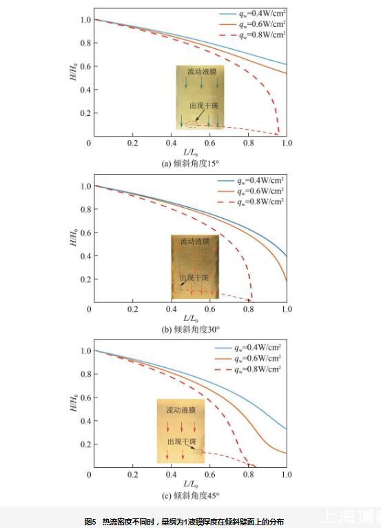 圖5所示的數(shù)學(xué)模型中,壁面傾斜角度分別為15°、30°和45°,噴淋密度為0.016kg/(m·s)、0.03kg/(m·s)和0.04kg/(m·s),入口溫度為70℃。通過施加不同的熱流密度加熱壁面,模型計算得出了量綱為1液膜厚度在傾斜壁面上的分布情況。結(jié)果顯示,當(dāng)熱流密度qw=0.8W/cm2時,不同傾斜角度下的壁面上量綱為1液膜厚度均逐漸減小,最終降至零,出現(xiàn)了燒干現(xiàn)象。同時,模型計算結(jié)果與實驗結(jié)果相符,干斑位置均出現(xiàn)在壁面底部,這一現(xiàn)象的產(chǎn)生不僅是由于蒸發(fā)的作用,還與熱毛細(xì)效應(yīng)密切相關(guān)。在加熱過程中,熱毛細(xì)效應(yīng)促進(jìn)了液膜表面張力的變化,使得液膜的穩(wěn)定性減弱,導(dǎo)致液膜局部破裂。隨著蒸發(fā)效應(yīng)的增強(qiáng),液膜厚度逐漸減小,特別是在液膜的薄弱區(qū)域,蒸發(fā)速率提高,導(dǎo)致液膜厚度進(jìn)一步減小,最終在底部區(qū)域發(fā)生破裂。因此,干斑通常出現(xiàn)在壁面底部,這進(jìn)一步驗證了實驗結(jié)果與數(shù)學(xué)模型計算之間的良好一致性,并表明所建立的數(shù)學(xué)模型能夠有效預(yù)測液膜在傾斜加熱壁面上的流動行為和燒干現(xiàn)象。