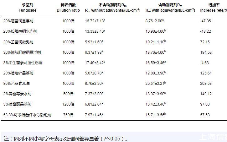 加入助劑前后,除20%噻菌銅懸浮劑、20%松脂酸銅水乳劑和3%中生菌素可濕性粉劑在‘貴妃'芒果葉片上的最大持留量(Rm)無顯著差異外,其他殺菌劑的Rm值均呈顯著差異。其中,80%乙蒜素乳油和30%琥膠肥酸銅懸浮劑的Rm值分別為(6.76±2.26)μL/cm2和(6.37±1.98)μL/cm2,加入助劑后藥液在葉片上的最大持留量可達(dá)(20.51±3.21)μL/cm2,效果最好,分別為增加了203.53%和194.53%。加入助劑后,藥液在單位面積葉片持留量的增加率從大到小依次為,80%乙蒜素乳油>30%琥膠肥酸銅懸浮劑>2%春雷霉素水劑>20%噻唑鋅懸浮劑>5%噻霉酮懸浮劑>30%壬菌銅微乳劑>53.8%可殺得叁仟水分散粒劑,持留量增加率分別為203.53%、194.53%、149.12%、125.61%、97.08%、72.15%和57.58%(表3)。