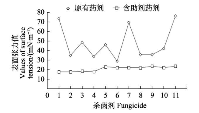 參照各供試殺菌劑田間推薦劑量,分別配置10 mL藥液2組,其中一組添加助劑,一組不含助劑。通過表面張力儀測試各藥液的表面張力值。每組設(shè)置3個(gè)重復(fù),以水作為空白對照。