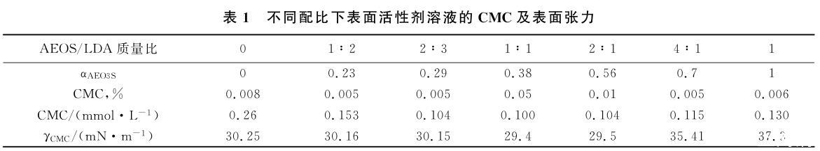 在25℃測試了AEO3S和烷醇酰胺LDA表面活性劑及其在不同質(zhì)量配比下溶液的表面張力,實驗結(jié)果見圖1。根據(jù)相對分子質(zhì)量計算出表面活性劑AEO3S的摩爾分數(shù)(αAEO3S)。由圖1中濃度與表面張力的關(guān)系得到溶液的CMC及對應(yīng)濃度下的表面張力,實驗結(jié)果見表1。