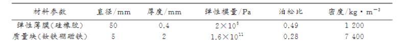 研究對象MAMs結構:彈性薄膜中心兩面粘結圓形質量塊。薄膜采用硅橡膠,通過勻膠機制備:按硅膠與固化劑100:3比例混合,低速檔(500 rpm,30s)甩開膠液,高速檔(1000 rpm,30s)均勻涂布于硫酸紙基底,靜置30min后剝離得到。高速檔轉速不同會導致薄膜厚度不同(如表1不同轉速所得薄膜厚度,具體值因排版缺失未完整顯示)。實驗中,薄膜制備厚度為0.4 mm。質量塊采用釹鐵硼磁鐵。材料參數詳見表2。