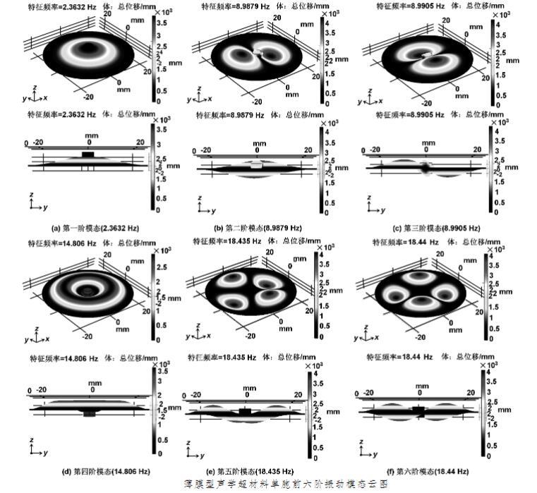 考慮聲波對薄膜的影響,在聲場仿真前進行模態(tài)分析以研究其在特定頻段聲波下的響應形態(tài)。使用COMSOL建立MAMs單胞模型進行模態(tài)仿真。
